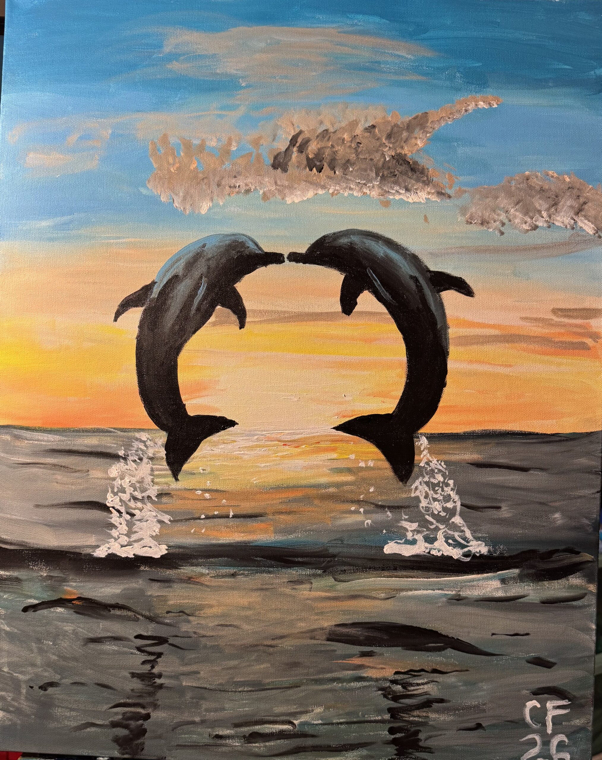 Two dolphins are captured in mid-air as they leap over the ocean at sunset. The sky is filled with vibrant colors, creating a dramatic backdrop.