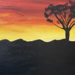 Vibrant hues of orange, red, and purple dominate the sky, capturing the breathtaking beauty of a sunset over a mountainous landscape. Fluffy clouds scatter across the sky, reflecting the brilliant colors of the setting sun.
